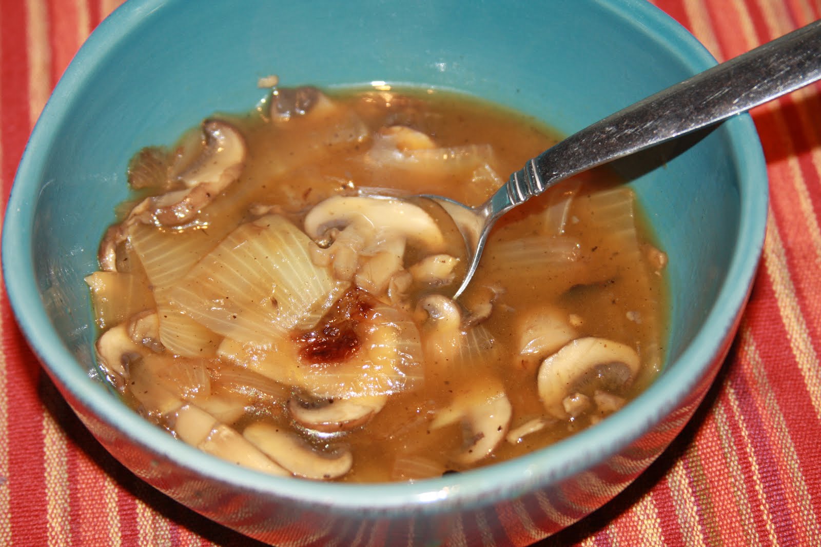 I cut the onion into slices and then quartered them. Placed them in a large pot with just a bit of olive oil. I sauteed them until they where caramelized. Once the onions were brown, transparent and yummy, I added the mushrooms and a half a can of vegetable broth to give the mushrooms a change to reduce a bit.